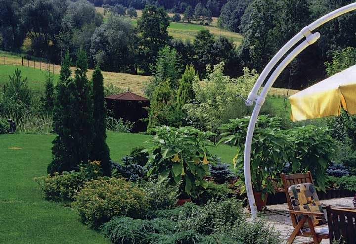 Wydawać by się mogło, że w ogrodach usytuowanych na falistym terenie, gdzie natura sama ustaliła spadki i wzniesienia, mamy teren przygotowany pod nasadzenia. W rejonach górskich i podgórskich gleba ma jednak bardzo często płytką warstwę urodzajną, a zastane ukształtowanie terenu wymaga korekt. Nie obyło się bez nich i w prezentowanym ogrodzie. Trzeba było przywieźć kilkanaście wywrotek ziemi, aby powierzchni rozległego trawnika nadać łagodny spadek, uformować podjazd do garażu, bezpieczną, choć dość stromą skarpę, żwirową ścieżkę poniżej skarpy, prowadzącą do wszystkich-fragmentów ogrodu, a także wyłożony płytkami, dwupoziomowy taras w sąsiedztwie basenu i oranżerii.